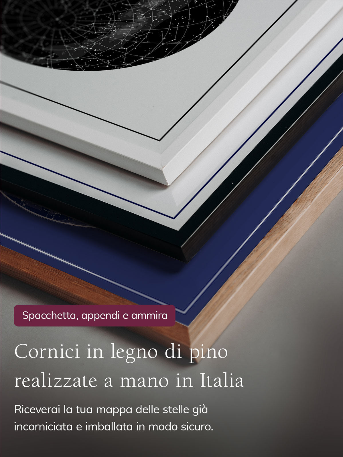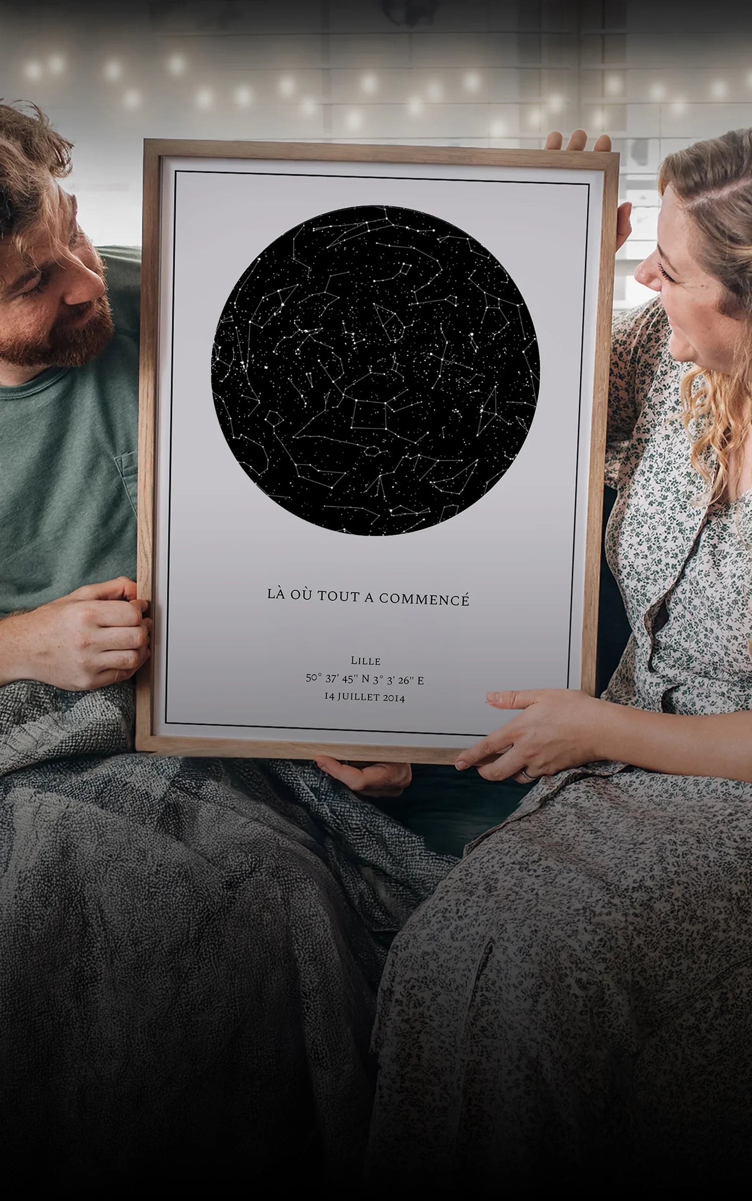 Choisis un endroit, une date et une heure qui symbolisent un souvenir qui t’es cher afin de l’immortaliser de manière personnelle. Chaque carte du ciel étoilé est unique !