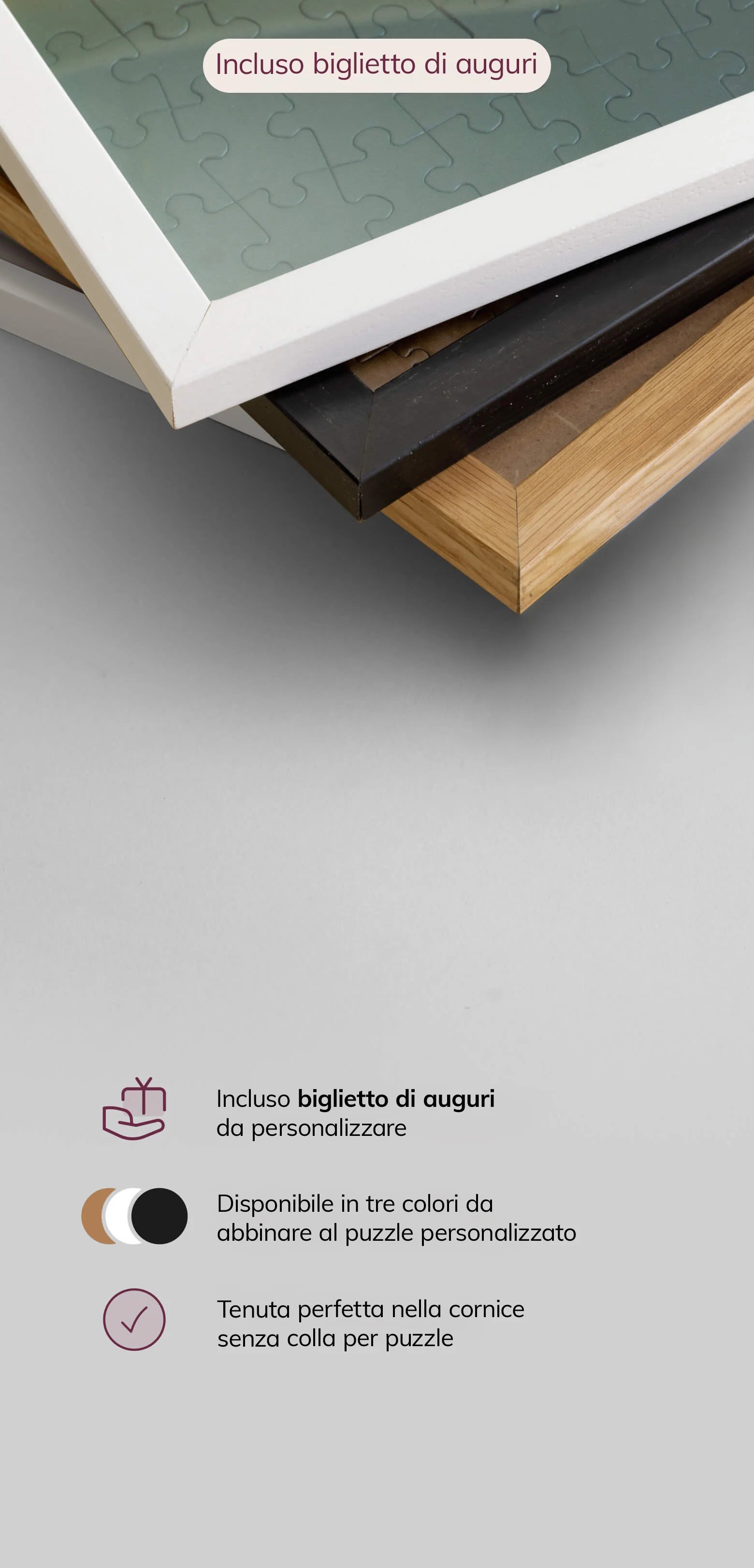 Il tuo puzzle personalizzato è un regalo fotografico unico che racconta di nuovo, pezzo dopo pezzo, i tuoi ricordi più belli. Scegli la tua foto preferita oppure crea un collage con fino a quattro immagini e trasforma un momento speciale in un puzzle di alta qualità con la tua foto. Che sia una vacanza, la prima foto insieme o un momento in famiglia, mentre lo componi, questi istanti tornano a prendere vita. Con la cornice abbinata, il tuo puzzle diventa un regalo personalizzato che dura nel tempo.