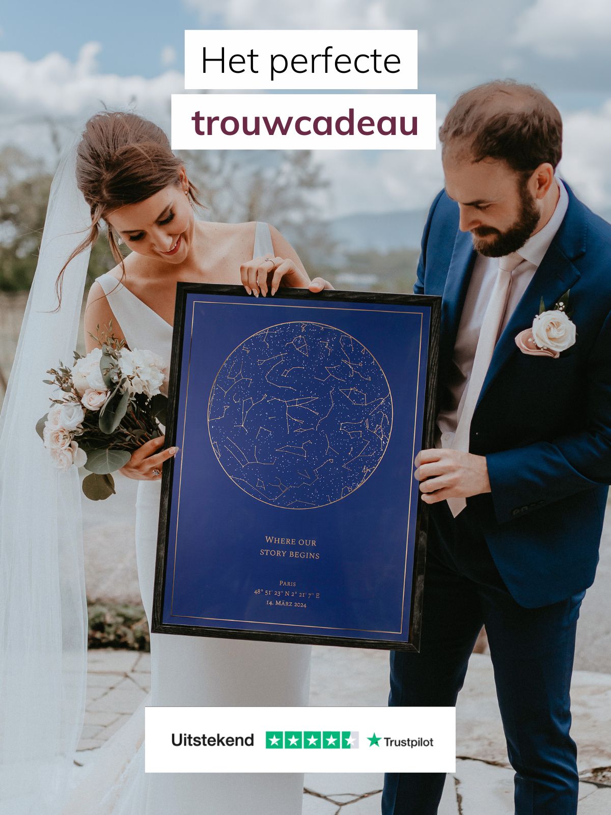 Geef het gelukkige paar een gepersonaliseerde kaart met de locatie en datum van hun trouwdag. Een persoonlijk en creatief huwelijkscadeau voor blijvende herinneringen.