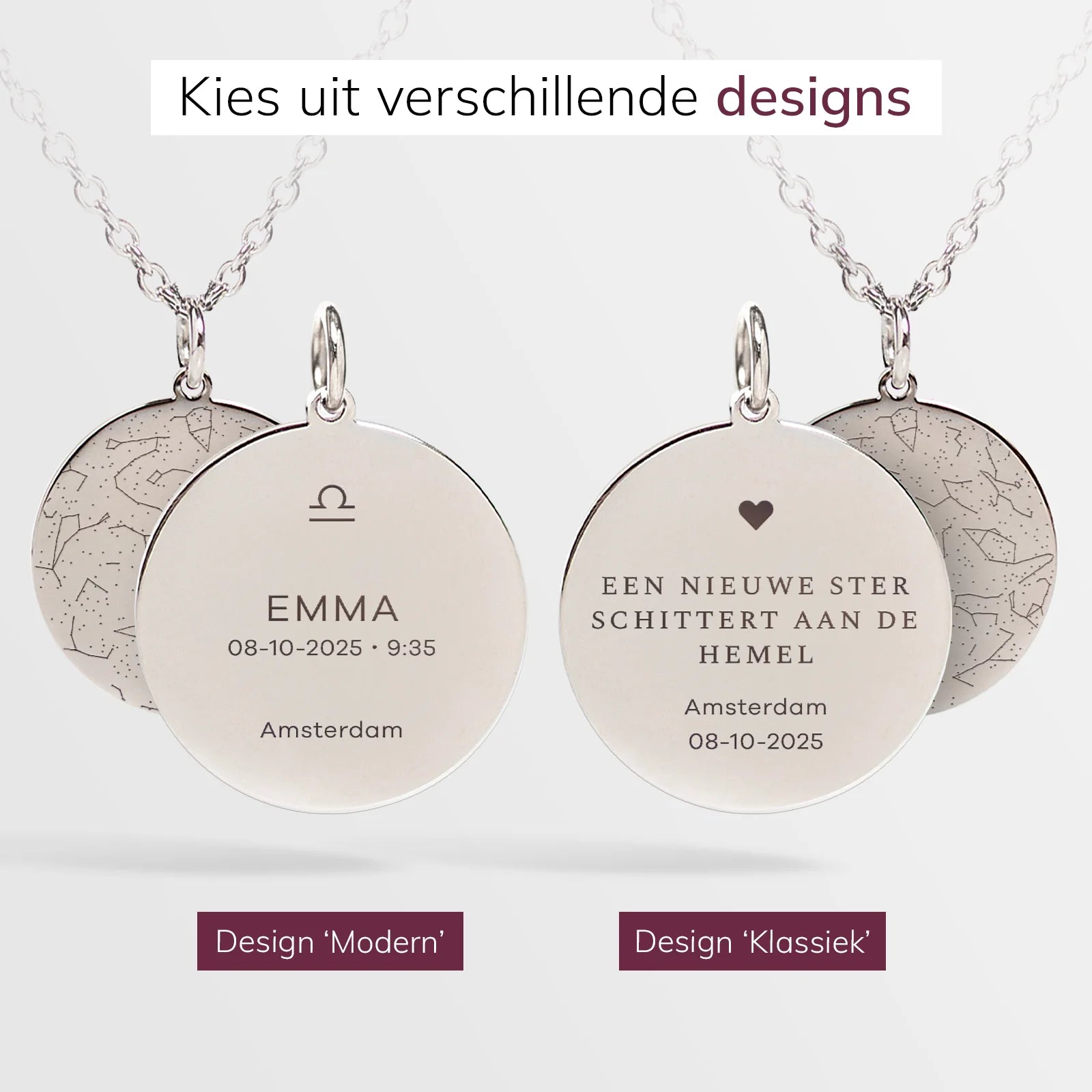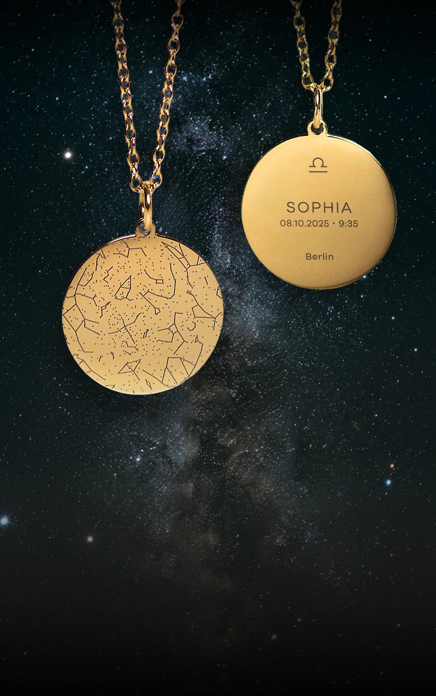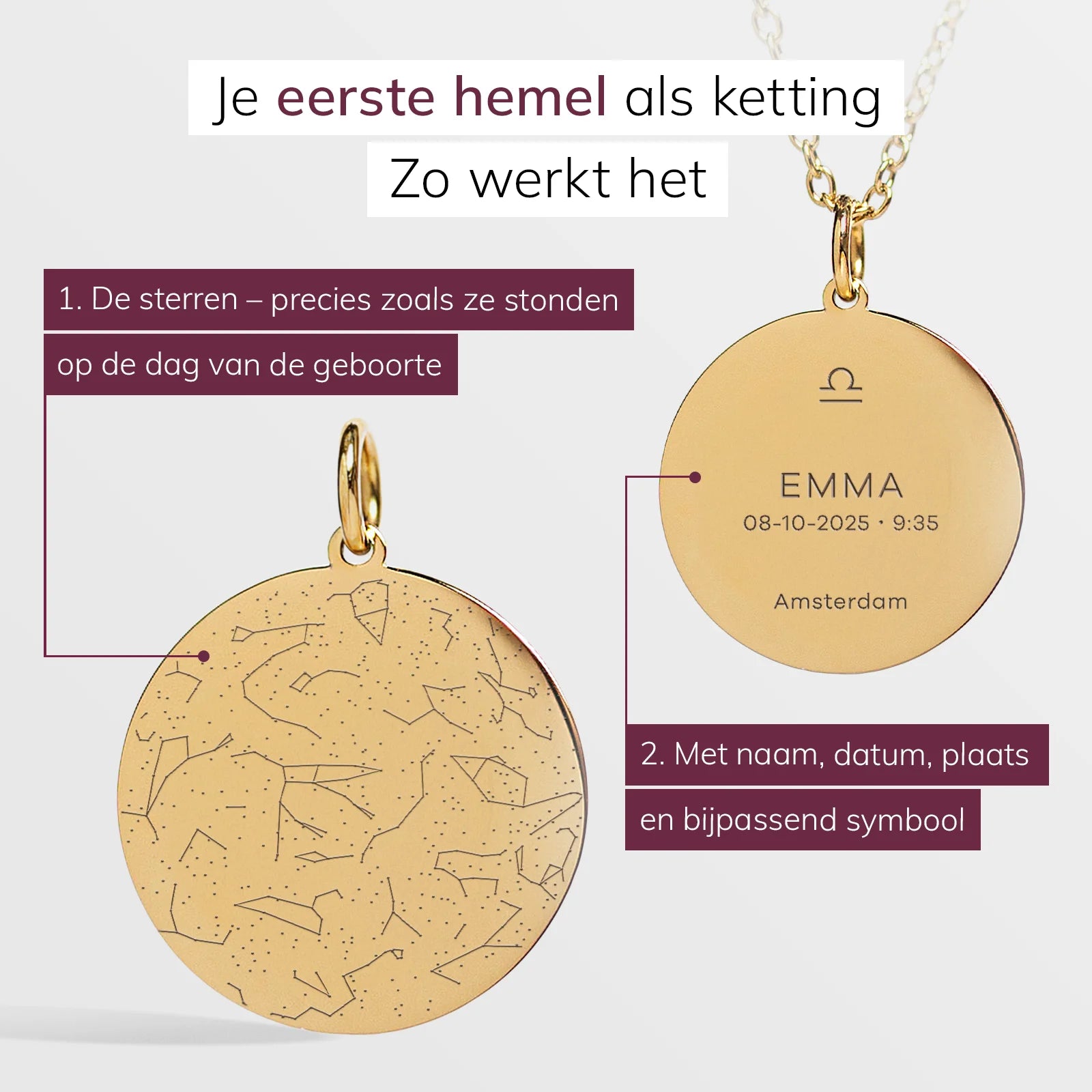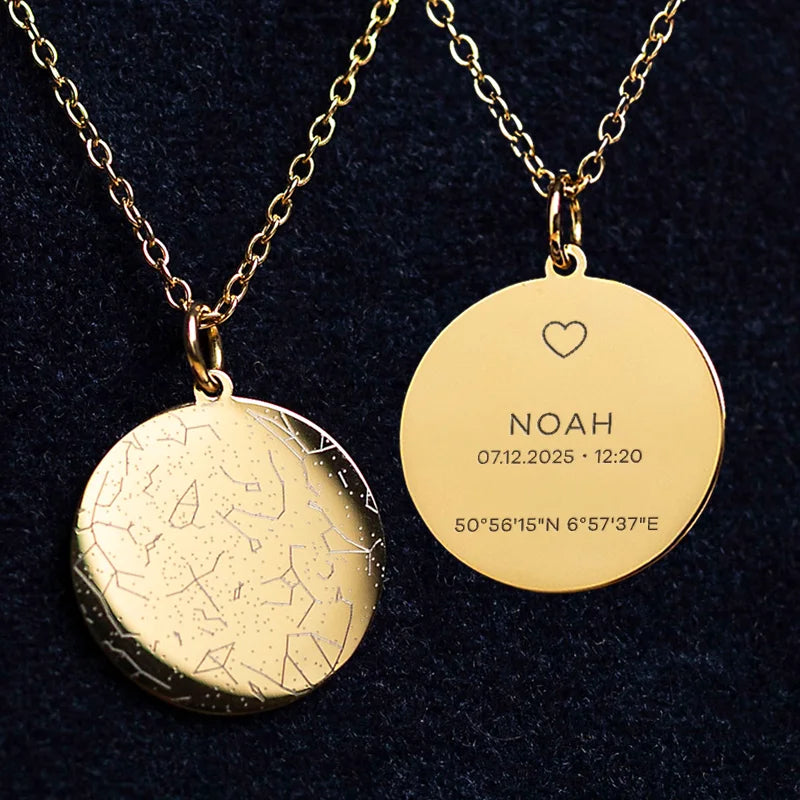 De hemel van een sterrenmoment – voor altijd vastgelegd in een unieke ketting met een persoonlijke gravure van naam, datum, plaats en sterrenbeeld.