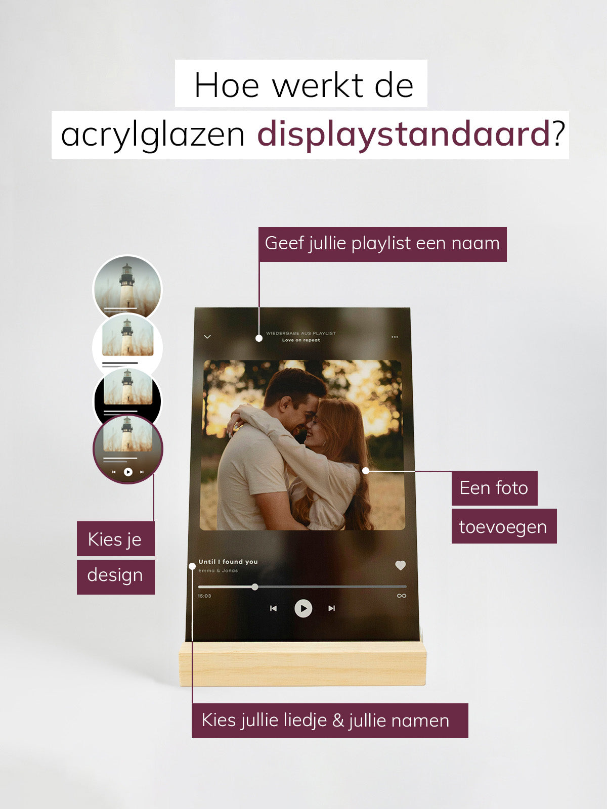 De keuze is aan jou: kies uit verschillende formaten – van discreet klein tot indrukwekkend groot. Combineer je favoriete design met persoonlijke aanpassingen en een foto die bij jou en je liedje past. Elke displaystandaard zal net zo uniek als jullie verhaal, als symbool van jullie band.