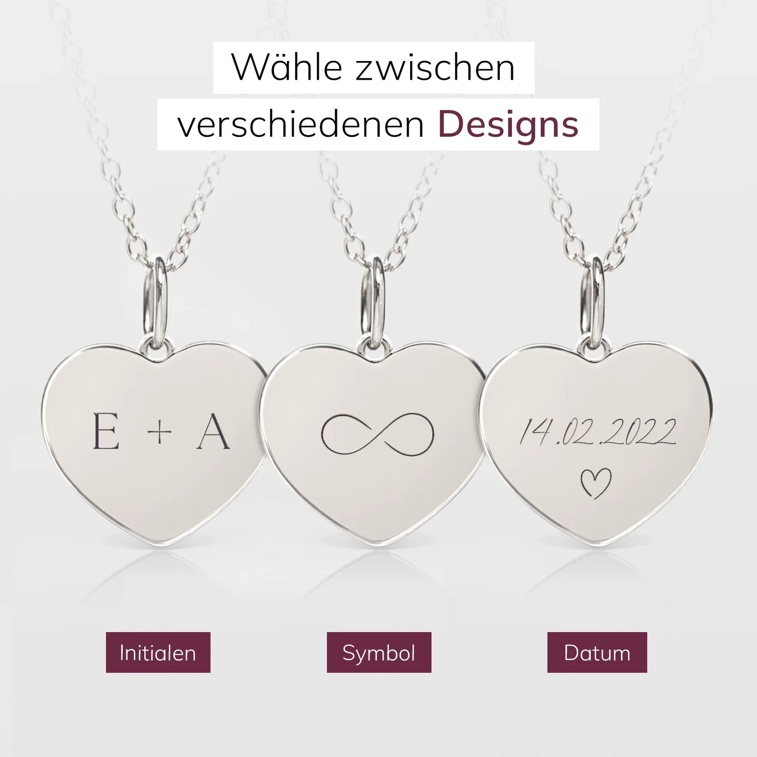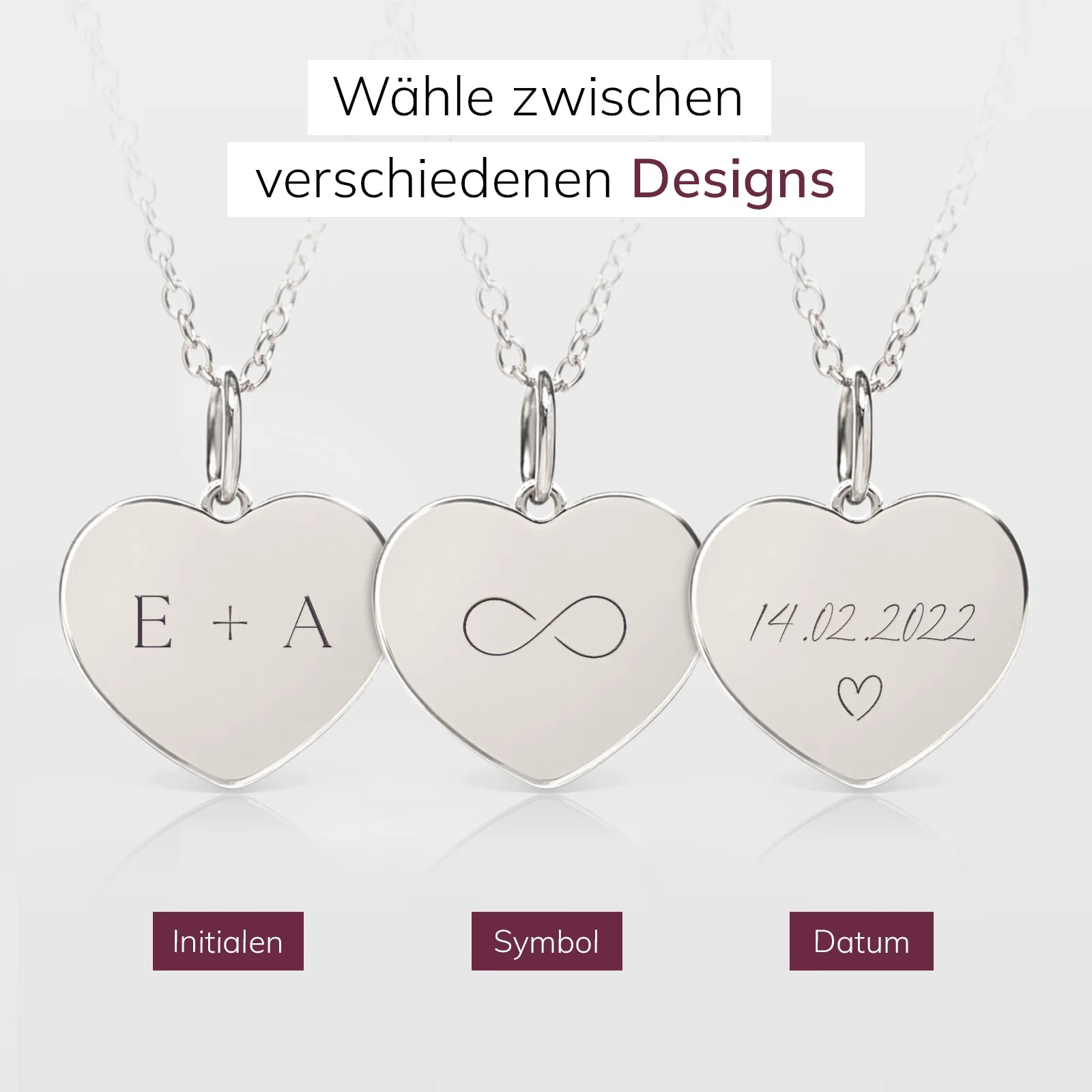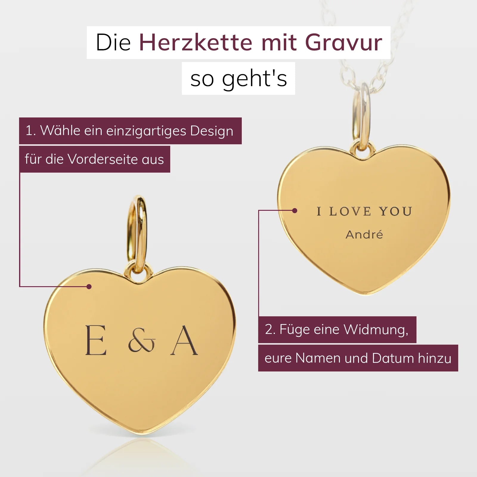 Personalisierte Herzkette mit Gravur – ein besonderes Valentinstagsgeschenk für deine Partnerin. Wähle ein Design und füge Widmung, Namen und Datum hinzu.