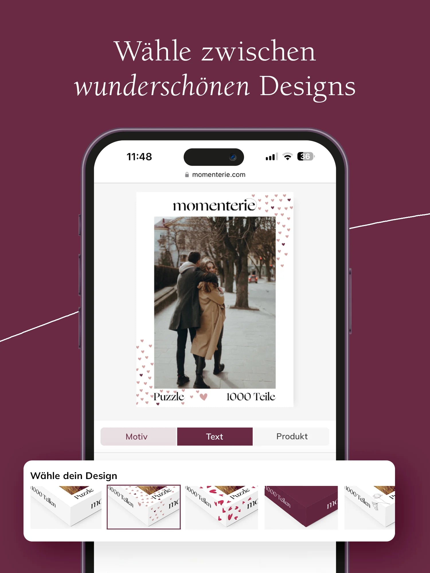 Du kannst dein Puzzle selbst gestalten. Lade dein Motiv hoch, wähle ein Layout und gestalte die Box passend zum Anlass. Dort kannst du auch eine persönliche Widmung ergänzen. 200, 500, 1000 oder 2000 Teile – du entscheidest, wie groß die Herausforderung sein darf. Präzise geschnittene Teile, farbechter Druck und hochwertige Materialien sorgen für langlebige Qualität.
